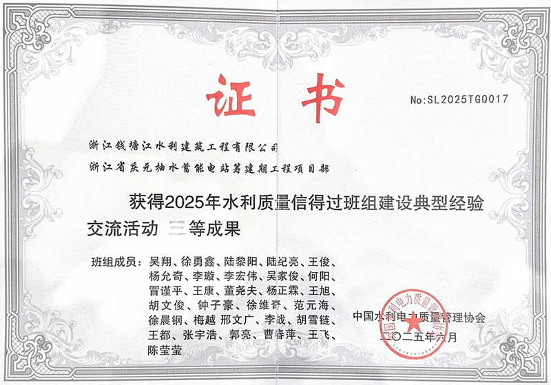 近日,中國(guó)水利電力質(zhì)量管理協(xié)會(huì)公布2025年度水利質(zhì)量信得過班組建設(shè)典型經(jīng)驗(yàn)交流活動(dòng)評(píng)選結(jié)果,慶元抽蓄籌建期EPC總承包項(xiàng)目憑借扎實(shí)有效的質(zhì)量管理實(shí)踐和突出的建設(shè)成果,榮獲“2025年水利質(zhì)量信得過班組建設(shè)典型經(jīng)驗(yàn)交流活動(dòng)”三等成果。這一榮譽(yù)不僅為“浙錢水建”品牌再添光彩,更標(biāo)志著公司在工程質(zhì)量管理領(lǐng)域獲得了行業(yè)權(quán)威機(jī)構(gòu)的高度認(rèn)可。
